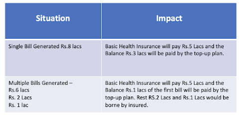 Example – Basic health insurance policy of Rs. 5 lacs and Top-up plan of Rs. 10 lacs, with a threshold of Rs. 5 lacs.