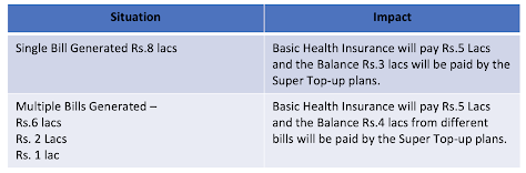 Example – Basic health insurance policy of Rs. 5 lacs and Super Top-up plan of Rs. 10 lacs, with a threshold of Rs. 5 lacs.