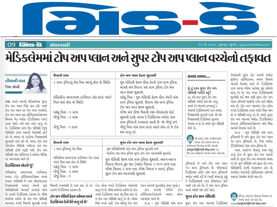 On May 19,2021 Gujarati Midday a daily newspaper by Jagaran group has published my article on Difference between Top Up Policy and Super Top Up Policy under Health Insurance. The article image is here for the ones who can read Gujarati and translation of the same in English is after the image for the readers, clients, friends and family.